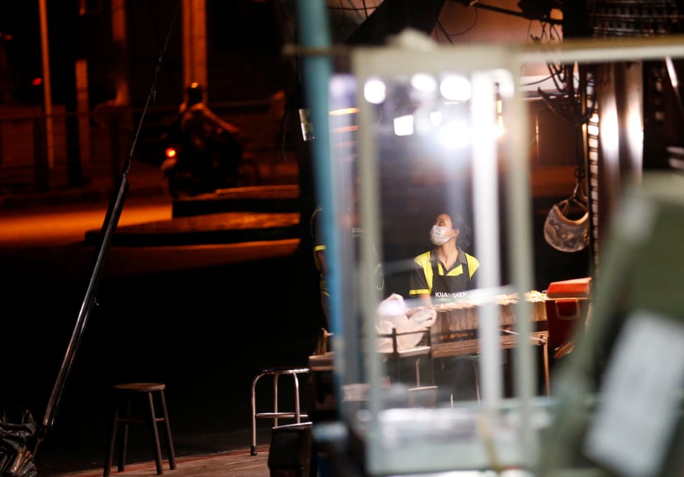 在曼谷(Bangkok)一處市場裡,一名經營攤販的婦女戴上口罩繼續做生意。