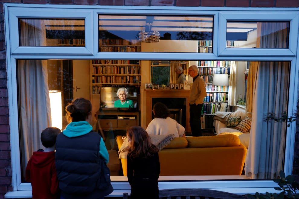 在曼徹斯特(Manchester),貝雷斯福德(Peter Beresford)、凱特(Kate Beresford)和花園內的其他家庭成員們,專注地看著英國女王伊莉莎白二世(Britain's Queen Elizabeth II)發表的電視講話。