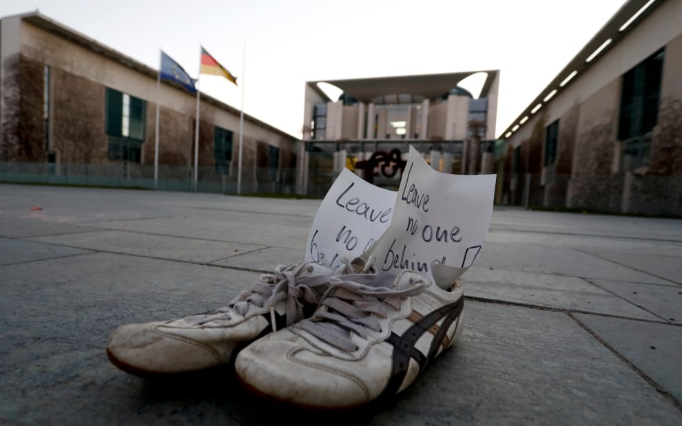 在位於柏林的德國聯邦總理府(German Chancellery),一雙被塞有「不要拋下任何人」字條的鞋子被示威民眾留了下來,他們帶著這雙鞋子前來要求當局協助住在希臘列斯伏斯島(Lesbos)上難民營的難民防疫。
