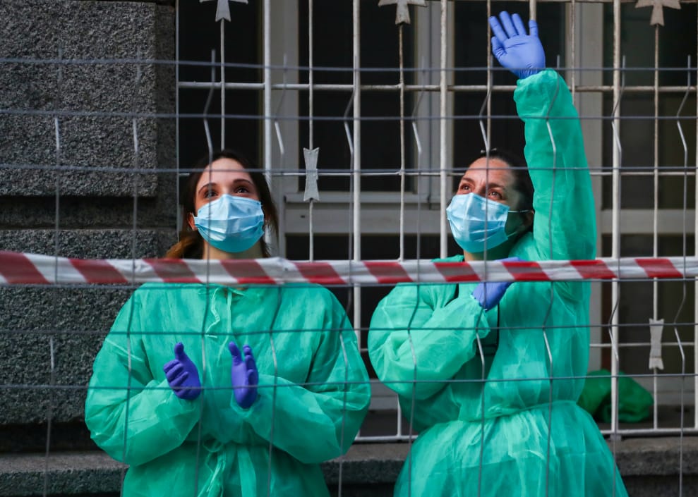 在馬德里(Madrid)的公主醫院(La Princesa hospital),醫護人員暫時走出醫院向周遭陽台上鼓掌感謝醫護人員付出的民眾致意。
