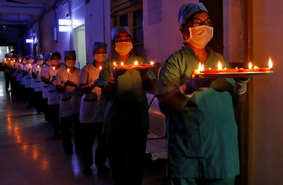 在印度的加爾各答(Kolkata),一所醫院的員工們端著蠟燭及小油燈,表達對COVID-19(武漢肺炎)的患者、全球各地醫生、護士及其他醫護人員的支持。