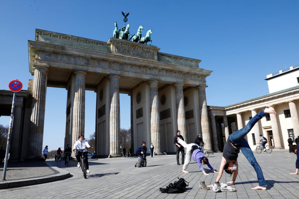 在柏林的布蘭登堡門(Brandenburg Gate)前,市民們紛紛趁著好天氣出門運動。