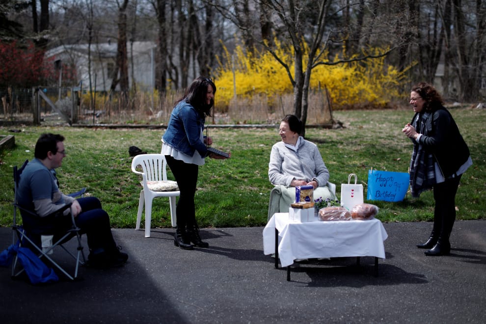 在紐約市的西奈阿克(West Nyack),1955年自義大利移民至美國、今年 94歲的法庫瑪(Marcella Ffalcomer,中)在兩位女兒史蒂芬妮(Stephanie Falcomer,左2)、席薇亞(Sylvia Falcomer,右)、孫子亨利(Petery Henry,左1)以及Zoom上幾位義大利家人們的祝福中,在車道上度過一個「保持社交距離」的 94歲生日。