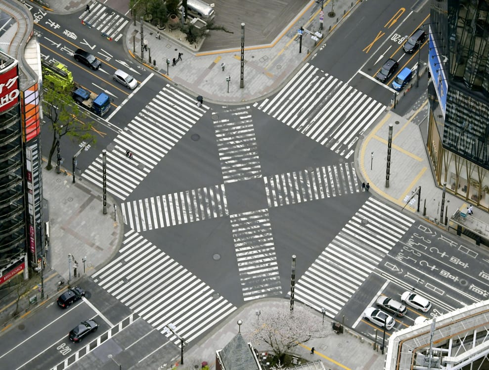 在東京銀座(Ginza)的一處十字路口,東京知事小池百合子(Yuriko Koike)敦促市民盡可能待在家後,十字路口上人來人往的景象也隨之消失。