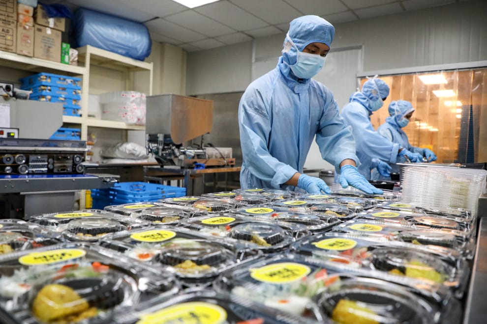 在馬來西亞沙阿南(Shah Alam)的一間工廠內,工作人員們正忙著替前線的醫護人員準備免費餐點。