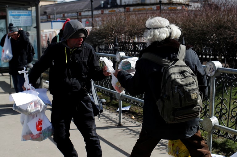 在莫斯科(Moscow)街頭,兩名街友因爭搶慈善機構Nochlezhka發放的食物及衛生補給品而起衝突。
