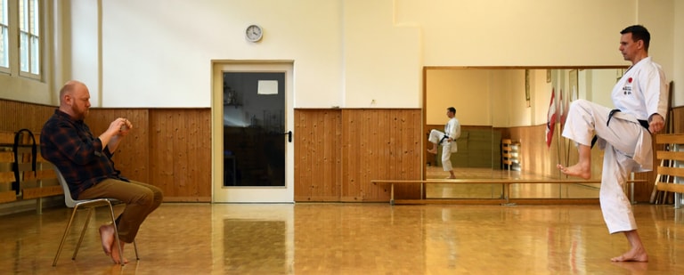 在柏林(Berlin),空手道俱樂部的教練萊丁(Dirk Leiding)正在拍攝一支準備用於線上訓練課程的影片。