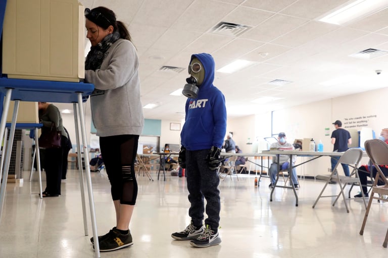 在威斯康辛州密爾瓦基(Milwaukee)的道格拉斯高中(Douglas High School)內,強(Kelly John)正在總統初選選票上圈選,而 8歲的兒子古納(Gunnar John)戴著防毒面具站在她身後。