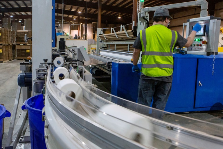 在緬因州的班戈(Bangor),衛生紙生產公司Tissue Plus的操作員尼克特(Matthew Niquette)操作一台機器將大捲衛生紙裁切成常見的單捲衛生紙。