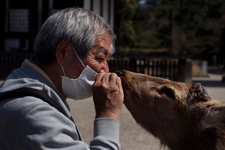 在日本當局呼籲民眾盡量不要去人群密集處之後,街頭少了人潮,讓奈良的代表性動物──鹿更加顯眼。