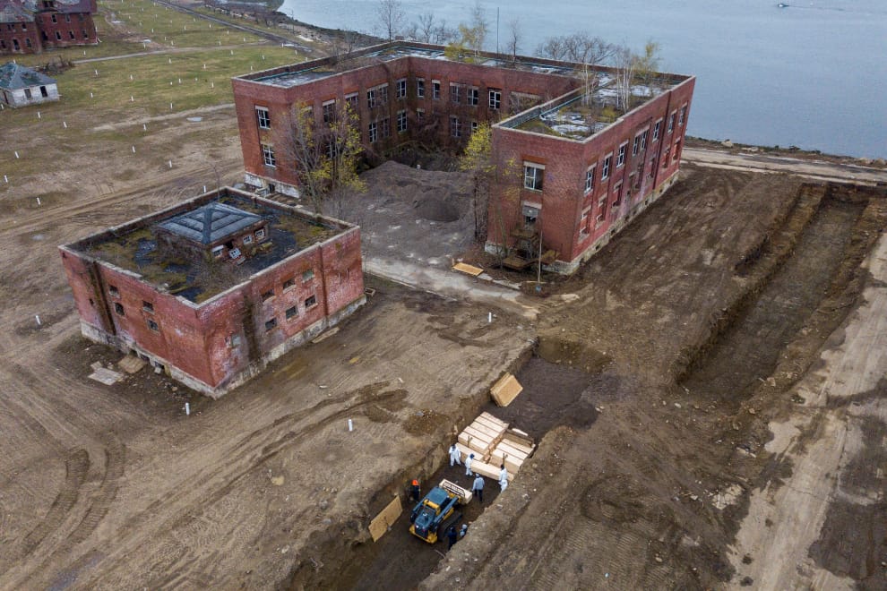在美國紐約的哈特島(Hart Island),無人機照片顯示島上的工作人員正在埋葬屍體。目前,紐約矯正署(New York City Department of Correction)正在想辦法處理日漸增加的遺體。