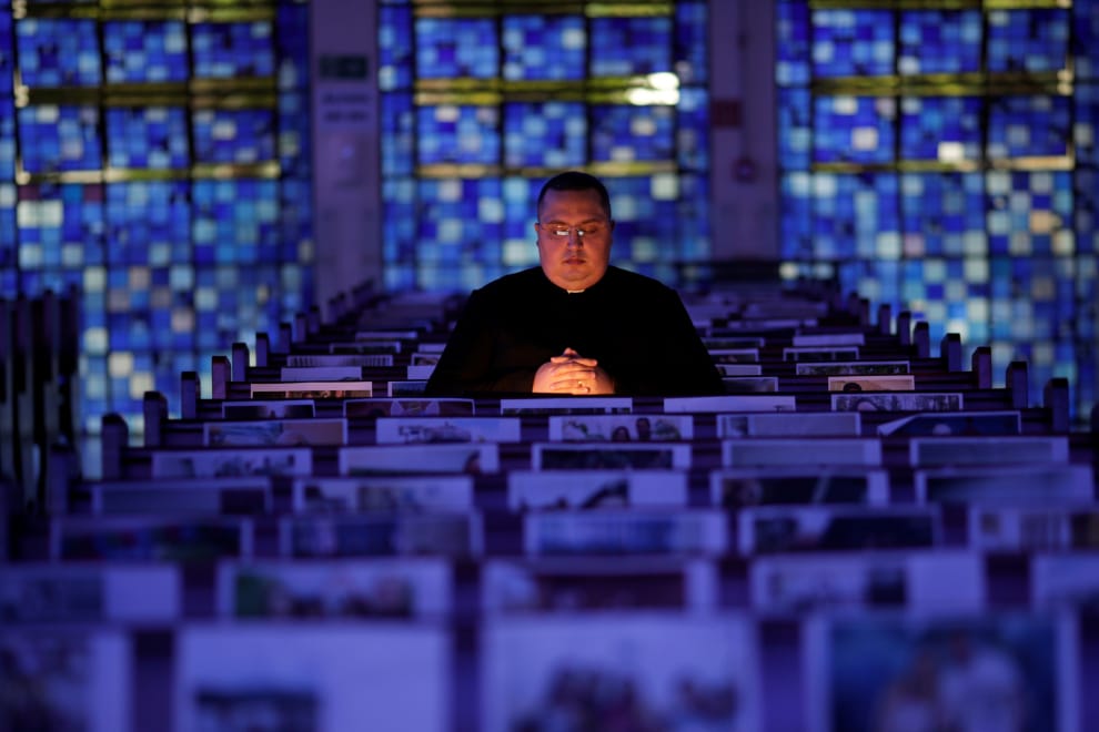 在巴西利亞(Brasilia),天主教神父寇斯塔(Jonathan Costa)在貼滿信徒照片的長椅中間默默禱告,準備隨後將於Santuario Dom Bosco教堂開始的彌撒直播。