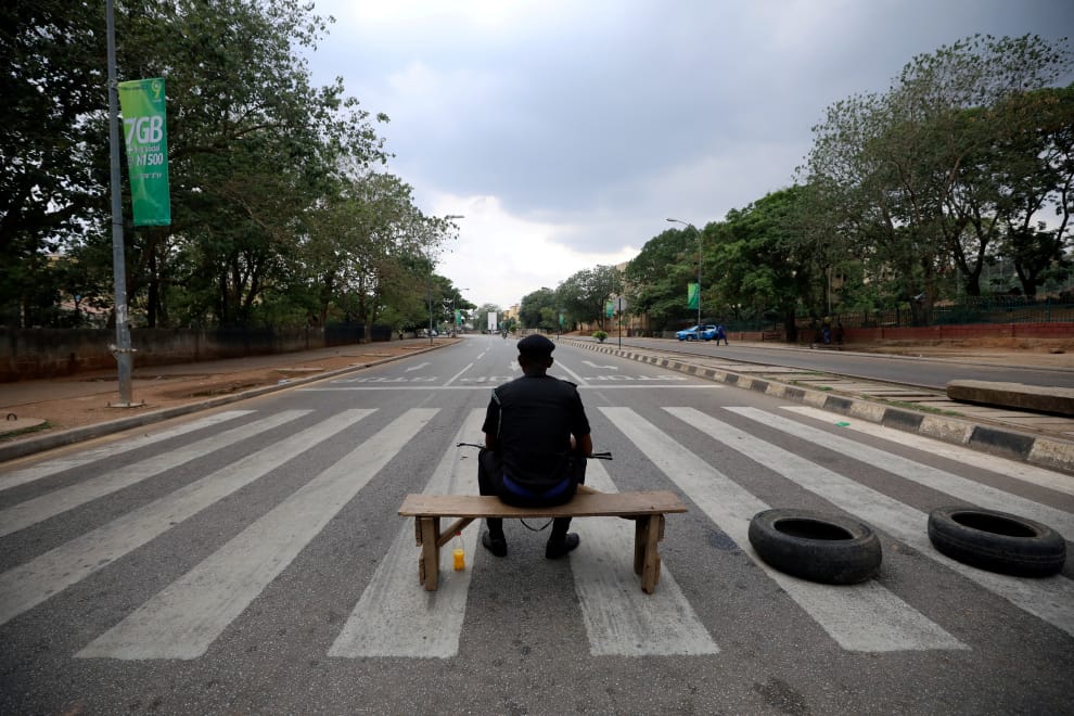 在奈及利亞首都阿布賈(Abuja),攝影師拍下一名警察坐在路障處值勤的身影。