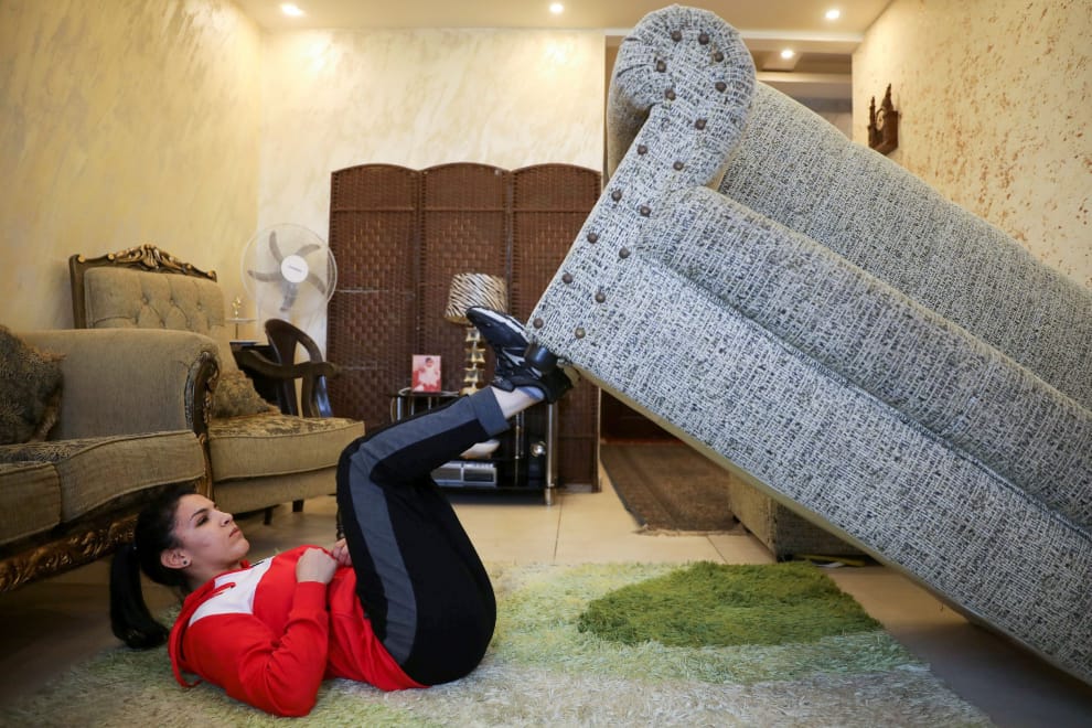 在約旦的安曼(Amman),柔道教練阿拉米(Hadeel Alami)用雙腳頂著沙發,做為宵禁期間居家訓練的一部分。