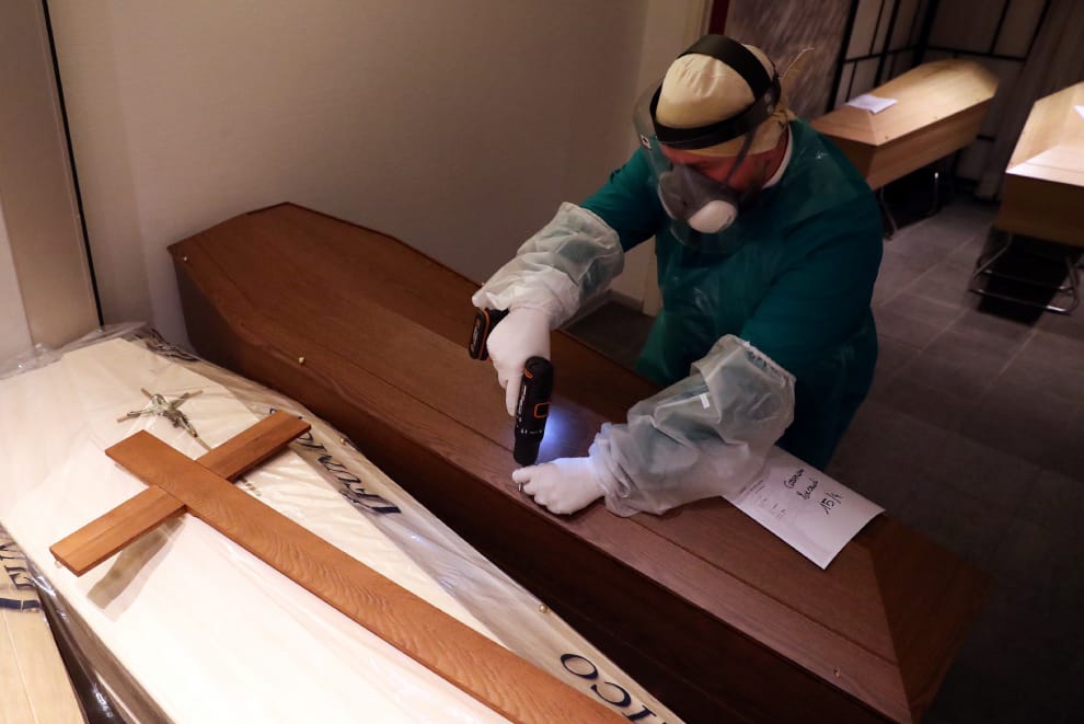 在布魯塞爾(Brussels),一名太平間的員工正在封棺。