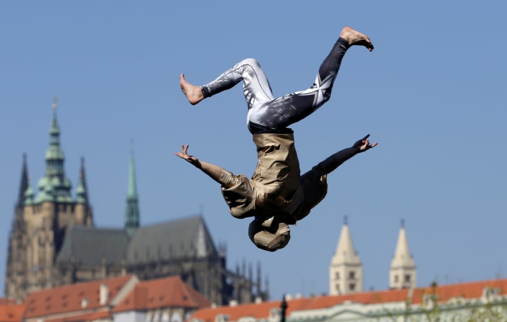 在布拉格(Prague),一名街頭藝術家以布拉格城堡(Prague Castle)為背景,在移動彈簧墊上表演後空翻,鼓勵當地因封鎖令而無法出門的民眾。
