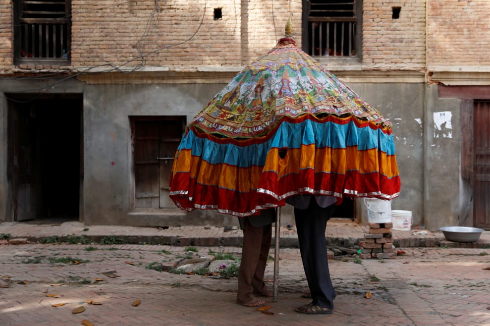 在尼泊爾的拉利特普爾(Lalitpur),兩名志工正在整理聖傘,以便在當地的傳統佛教慶典Rato Machhindranath中使用。