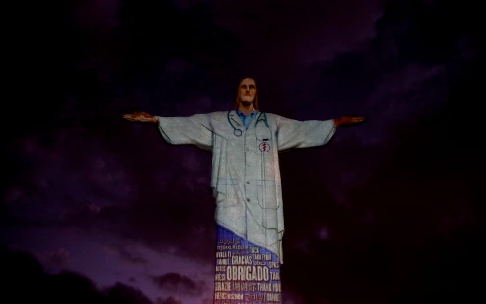 在里約熱內盧,救世基督像被投影上了白袍和各種語言的謝謝,感謝在防疫第一線醫護人員的辛勞。
