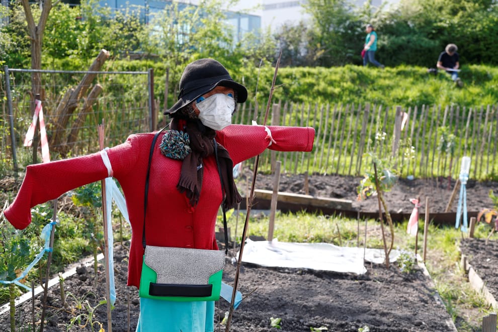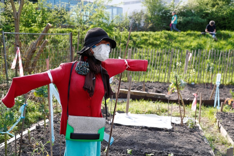 在布魯塞爾的一處社區菜園中,人們給稻草人戴上了口罩。