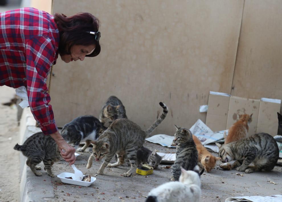 在首都開羅街頭,一名女子正在餵流浪貓吃飯。