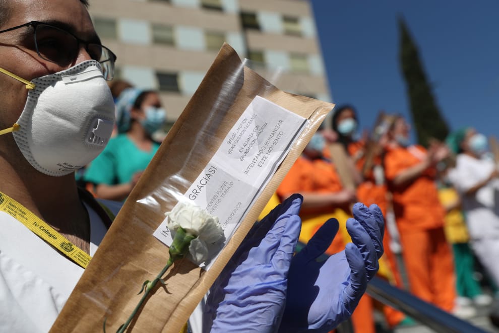 在馬德里的格雷戈里奧馬蘭農醫院(Gregorio Maranon)外,收到玫瑰花和感謝函的醫護人員出面向民眾致謝。