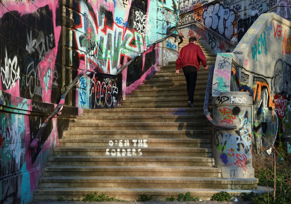 在柏林一處台階上,可以看到寫著「開放邊界」字樣的標語,呼籲當局在COVID-19(武漢肺炎)疫情蔓延的期間,不要忘了救援移民。