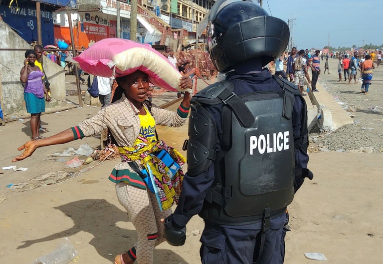在首都蒙羅維亞(Monrovia)的紅燈市場,警察們要求在路上移動的民眾全部回家去,共同協助國家一起對抗COVID-19(武漢肺炎)疫情,避免群聚感染。
