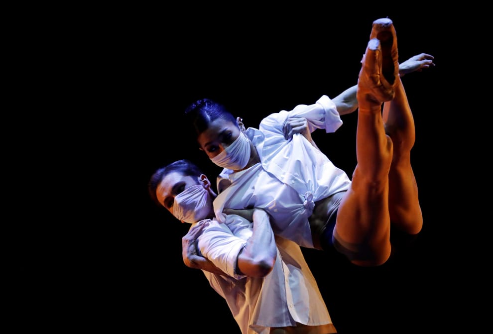 在布拉格國家劇院,來自捷克國家芭蕾舞團的舞者戴上口罩排練公益舞碼。