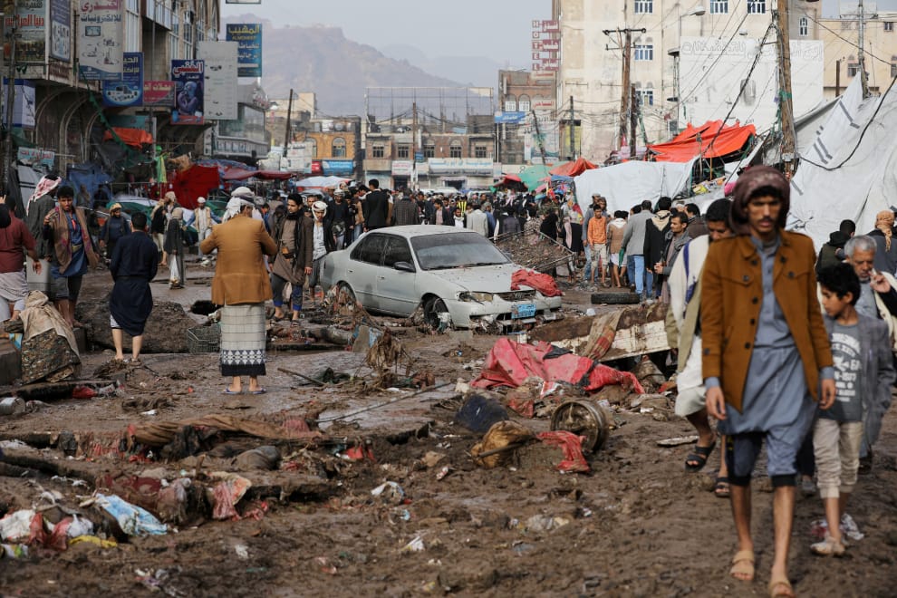 在首都沙那,豪雨讓當地陷入混亂,原本平坦的土地變得泥濘不堪,民眾得拉起褲管前行。