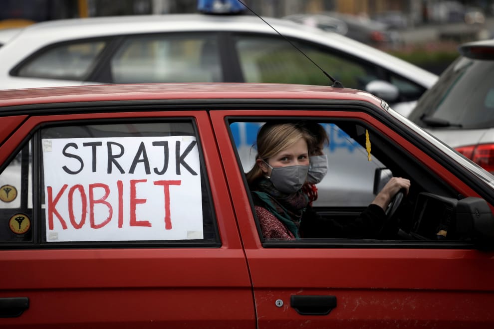 在首都華沙街頭,示威民眾開著貼有「女性罷工」字樣的海報,抗議波蘭國會趁著COVID-19(武漢肺炎)疫情蔓延期間,試圖對女性墮胎和性教育設下新的限制。