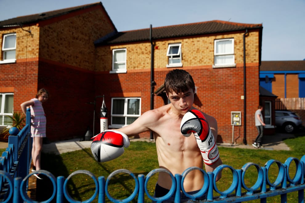 在首都貝爾法斯特,今年 17歲的傑瑞德(Gerard)在自家後院練拳,為居家隔離生活增添趣味。