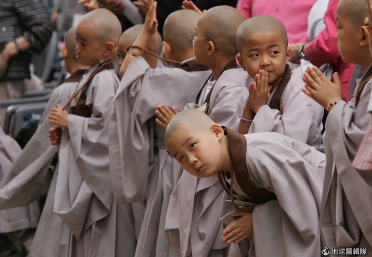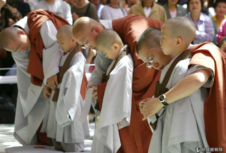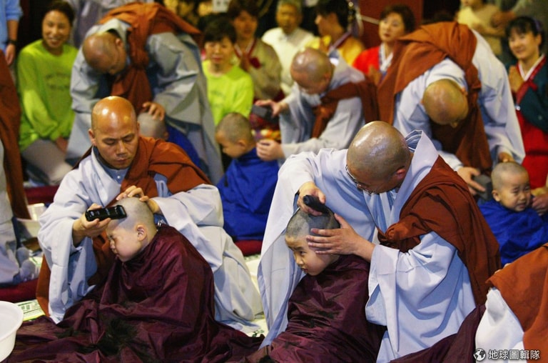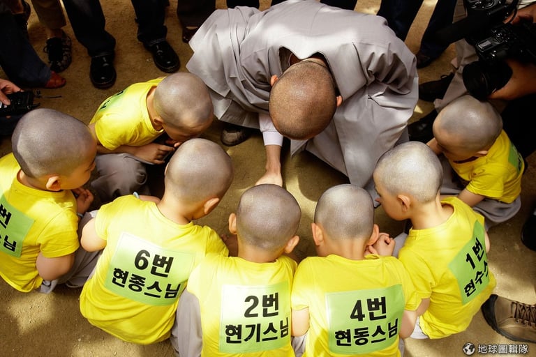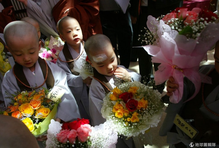 全部的小朋友都剃完頭髮後,開始行禮進行接下來的入寺過程。圖片來源:Chung Sung-Jun/Getty Images