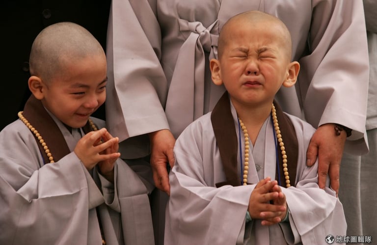 剃完頭髮的小和尚,破涕為笑的看著一邊還正在被「行刑」的小和尚,好有意思的畫面!圖片來源:Chung Sung-Jun/Getty Images