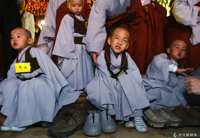 完成出家的過程後,小和尚們排排站。圖片來源:Chung Sung-Jun/Getty Images