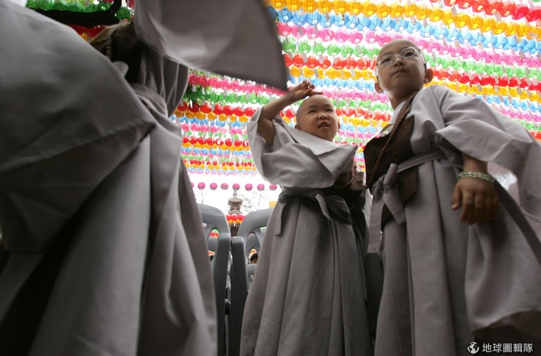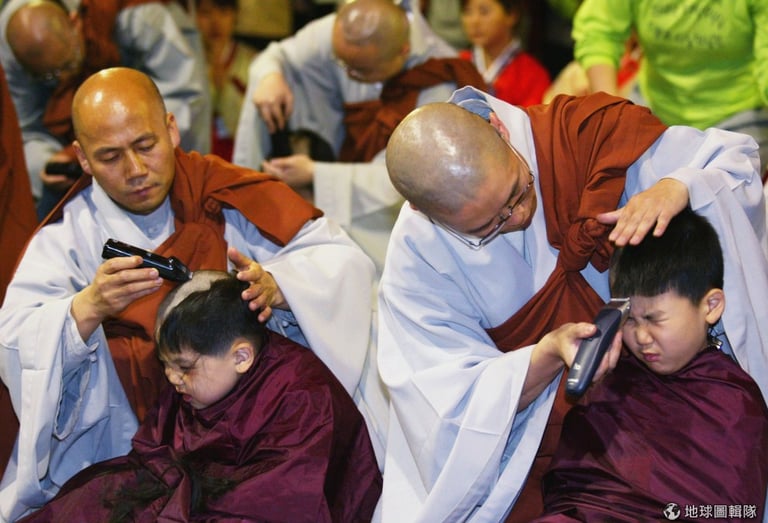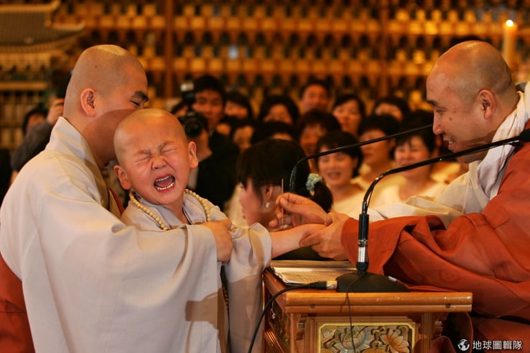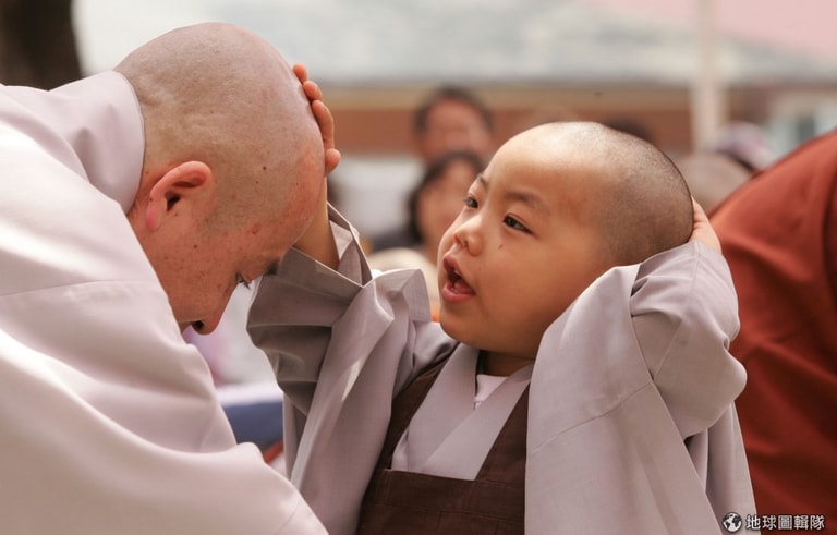 師傅要幫小朋友穿好袈裟,小和尚摸著自己的小光頭不過癮,還摸起師父的頭來!圖片來源:Chung Sung-Jun/Getty Images