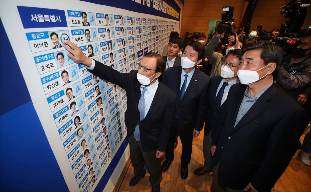 南韓執政黨共同民主黨黨主席李海瓚,手拿貼紙貼在順利當選國會議員的黨員照片上。