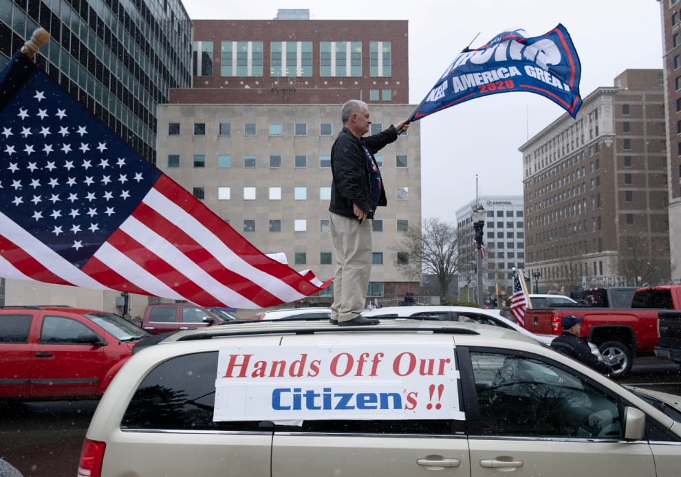 在密西根州首府蘭辛(Lansing),密西根保守聯盟的支持者一邊揮舞支持美國總統川普(Donald Trump)的旗幟,一邊抗議密西根州政府打算延長居家隔離令。參與抗議的車輛上貼著寫有「把手從人民身上拿開!」的字樣。