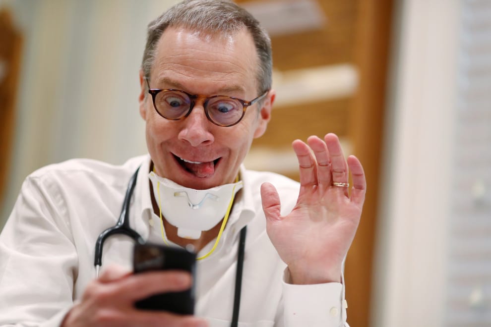 在紐約州的牡蠣灣,小兒科醫師古爾布蘭森(Greg Gulbransen)用視訊的方式和小病人打招呼。受到COVID-19(武漢肺炎)疫情蔓延的影響,古爾布蘭森醫師不得不改變平常的作息和工作方式,改用視訊的方式掌握小病人們的狀況。