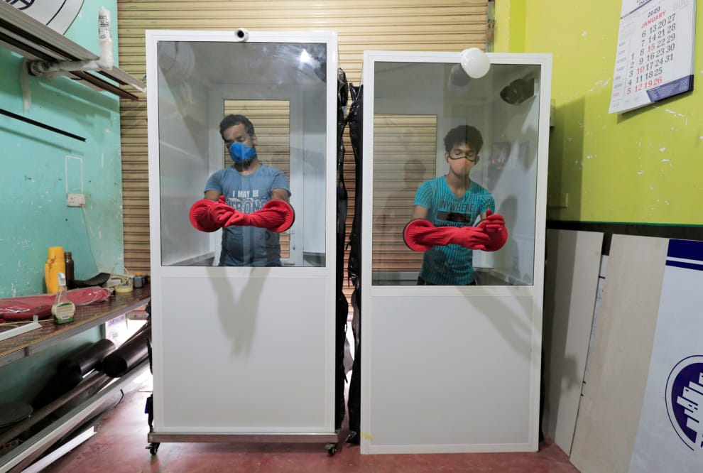 在首都可倫坡,兩名工作人員走進他們為醫院醫護人員設計的簡易檢測站,這款檢測站可以讓醫護人員在不直接接觸受檢者之下採檢。