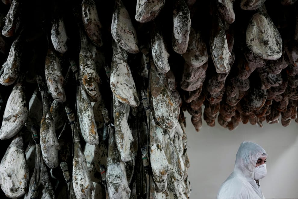 在西班牙西北部的吉胡埃洛(Guijuelo),頂級火腿品牌小何塞(Joselito)的第六代傳人戈梅茲(Jose Gomez)在存放火腿的地窖受訪,談論疫情對西班牙火腿業造成的影響。