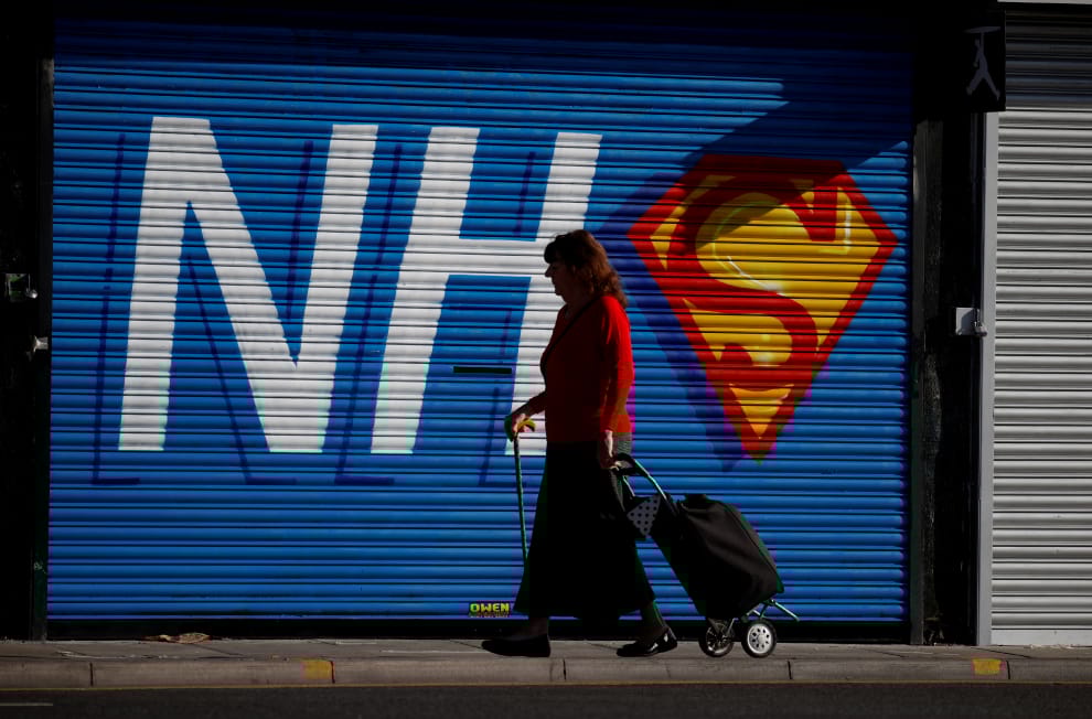 在利物浦街頭,一名女子走過一面將英國國民保健署(NHS)畫成超人的壁畫。