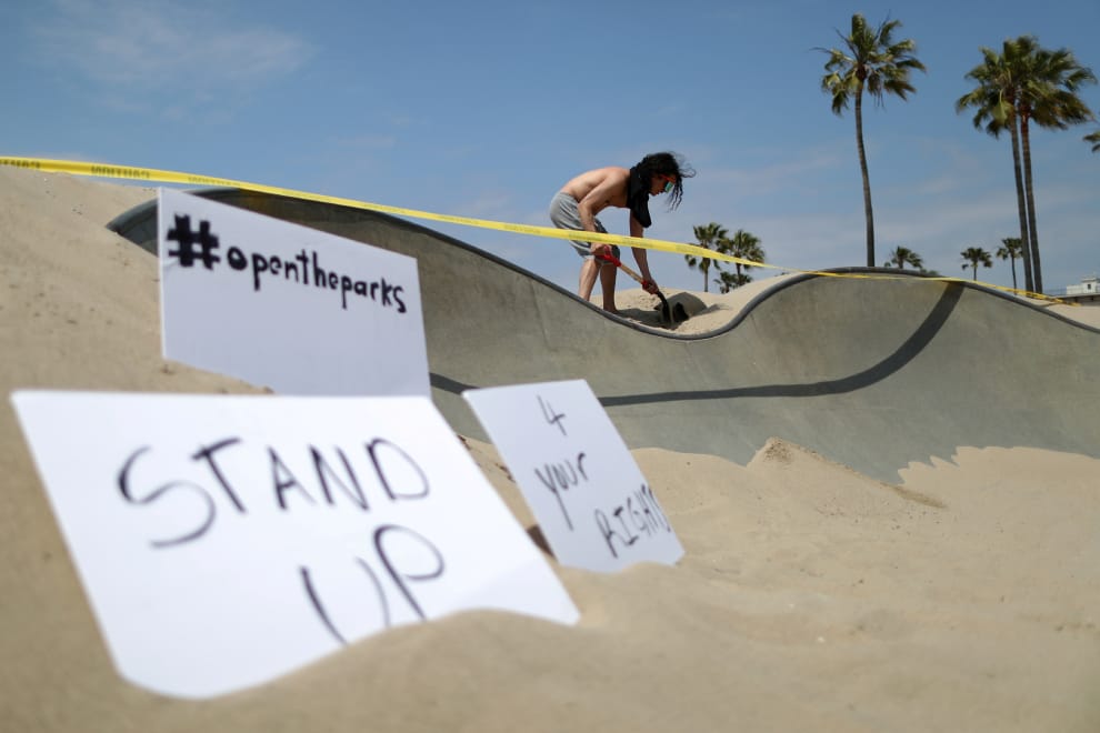 在加州洛杉磯的威尼斯海灘上,今年 33歲的施瓦茲(Jesse Schwartz)在遭到關閉的公園內挖沙抗議,反對當局遲遲不放鬆封鎖令。他在沙灘上立起了寫有「#開放公園」、「為了你的權利」、「站起來」字樣的抗議標語。