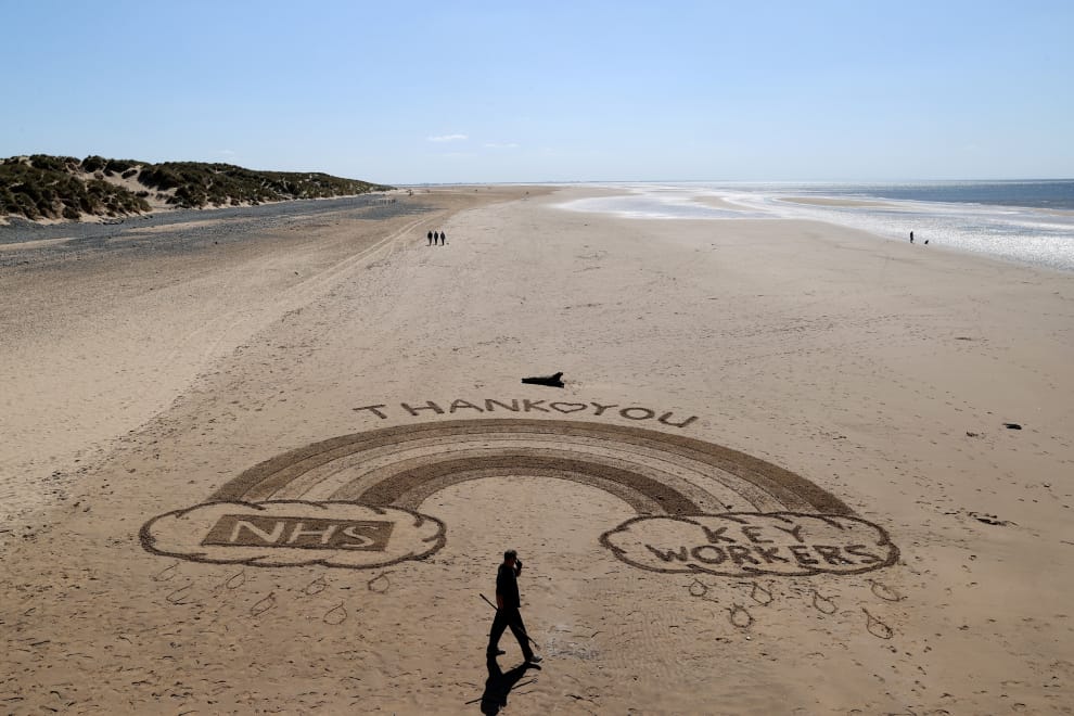 在靠海的萊瑟姆聖安妮市(Lytham St Annes)沙灘上,來自桑迪門塔爾藝術團隊的班(Ben)在沙灘上作畫,用彩虹的意象感謝防疫期間辛苦的英國國民保健署(NHS)醫護人員和其他重要的工作人員。