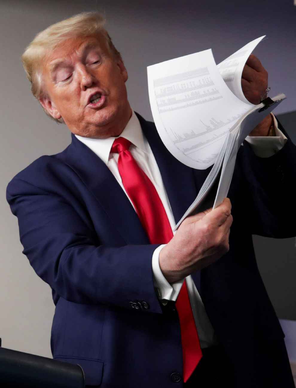 在白宮防疫記者會上,美國總統川普(Donald Trump)向媒體展示一份清單,上面列出了全美提供COVID-19(武漢肺炎)檢測的地點。