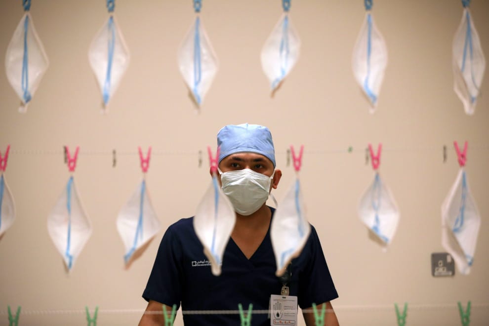 在阿布達比的克里夫蘭臨床醫院(Cleveland Clinic hospital),一名技師掛出N95口罩並且用紫外線來消毒。在口罩大缺貨下,這是唯一讓醫護人員還有口罩可以使用的方法。
