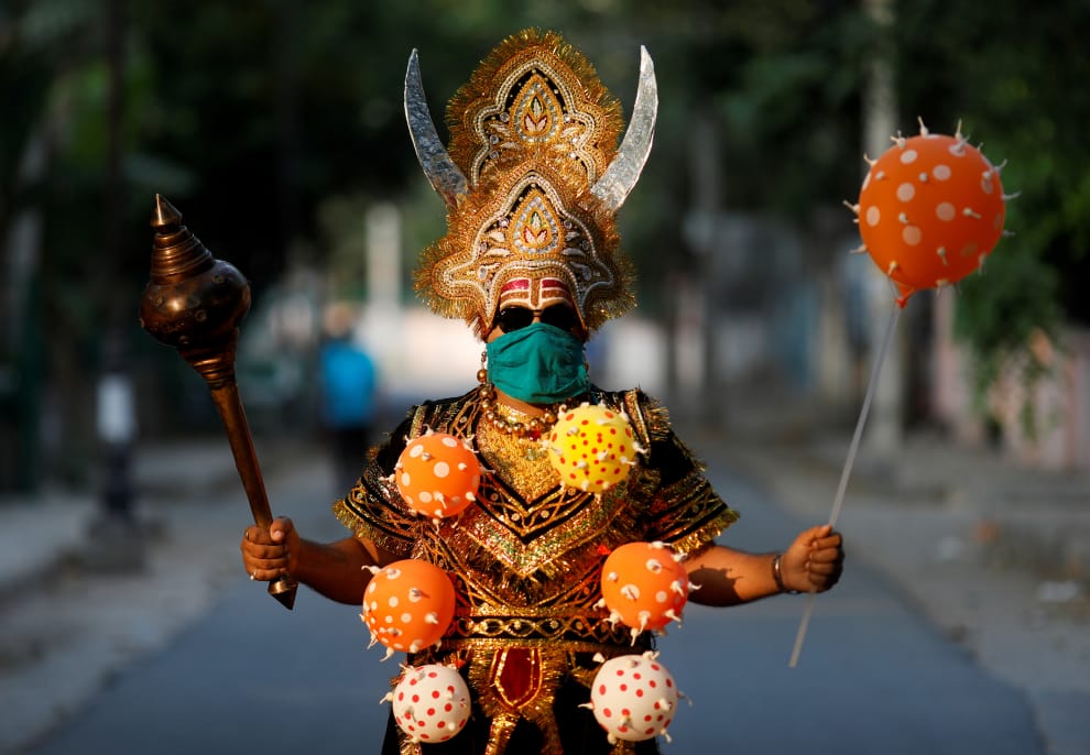 在新德里(New Delhi),民眾打扮成印度死神亞姆拉吉(Yamraj)的樣子,配戴一條新型冠狀病毒(SARS-CoV-2)造型的氣球項鍊,呼籲人們保持社交距離。