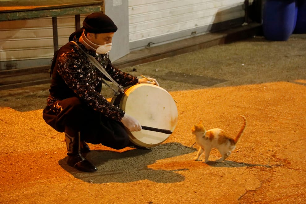 在約旦河西岸的以色列占領區那布魯斯(Nablus),目前正值伊斯蘭教重要的齋戒月(Ramadan),一名巴勒斯坦的宣禮員戴著口罩在路上擊鼓喚醒穆斯林們,好在日出禁食開始之前能夠先吃點食物。