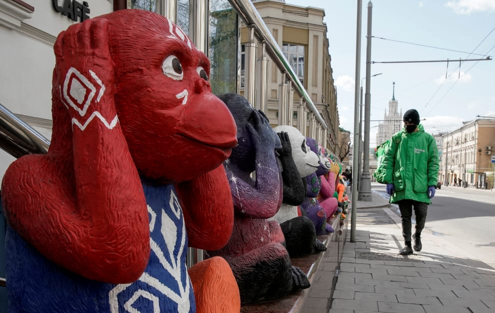 在莫斯科(Moscow),一名身穿綠色外套的外送員,從咖啡廳擺出的一排彩色動物作品前經過。