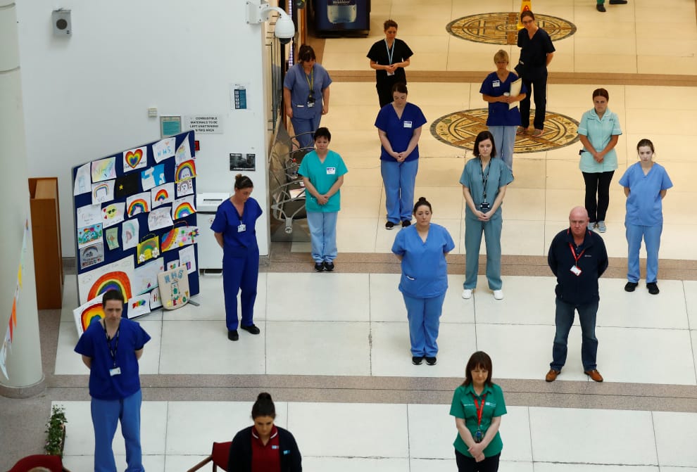 在首都貝爾法斯特(Belfast),馬特醫院(Mater Infirmorum Hospital)的員工一同佇立默哀一分鐘,哀悼所有在防疫過程中死去的英國國民保健署(NHS)醫護人員。