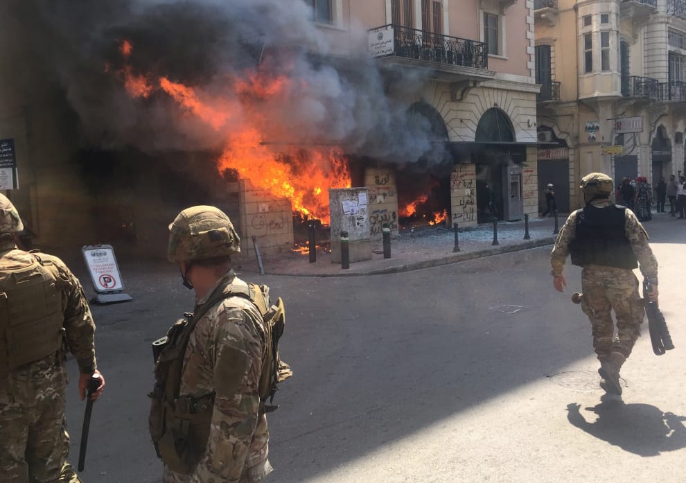 在的黎波里(Tripoli),嚴重的經濟危機再度引發激烈的街頭示威活動,士兵們現身於一間遭示威民眾縱火的銀行前。